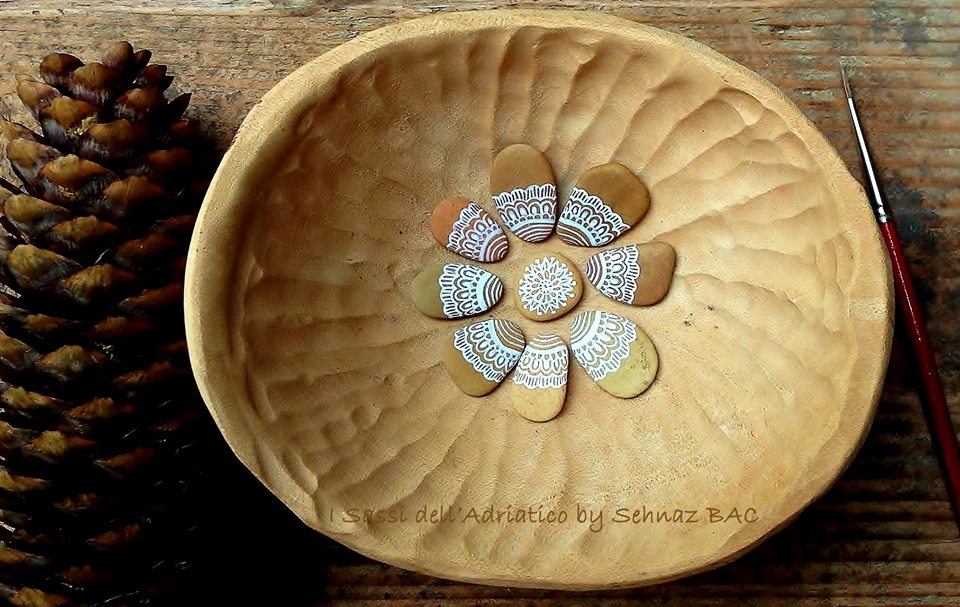 «I Sassi Dell’Adriatico by Sehnaz Bac» Sehnaz Bac nació en Estambul, y vive en una pequeña ciudad italiana, cerca del Mar Adriático, es arqueóloga y trabajó en excavaciones como Éfeso, Sardis y Symrna. Después de una larga guerra contra un linfoma, Sehnaz dice: «gané y entendí que todos los días de nuestra vida son un regalo para nosotros, y he creado un mundo para mí, lleno de colores, buenas energías, naturaleza y serenidad con mis pinturas y mis piedras del Adriático». Durante su enfermedad, Sehnaz daba largos paseos por la playa cerca de su casa, y empezó a recoger conchas y piedras de la playa, hasta que en un libro vió un jardín decorado con piedras pintadas y su vida cambió. «…, pintar las piedras de colores, me dan energía positiva y lo más importante, comencé a despertar cada mañana más feliz. Ahora pinto todos los días, me baso en patrones, he creado una página de Facebook en relación con las piedra pintadas llamada «I Sassi dell’Adriatico» .» Lo que empezó como un pasatiempo fue convirtiéndose en una verdadera vocación para Sehnaz.